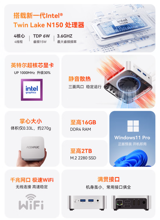 处理器:12代Intel N150(4核/4线程/TDP6W)