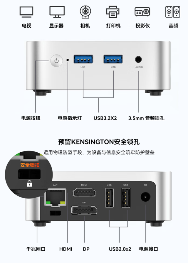 就像哪吒的乾坤圈能降服万物,阿迈奇V1的接口配置堪称迷你主机界的"万金油"。提供了丰富的配置选项。主机正面设有 2 个 USB-A 3.2 Gen 2 接口和 1 个 3.5mm 音频接口;背面则包括 1 个 HDMI 2.0 接口、1 个 DP 1.4 接口、2 个 USB-A 2.0 接口、1 个 RJ45 网络接口以及 1 个 3.5mm 音频接口。这些接口能够满足用户在多媒体连接和数据传输方面的需求。